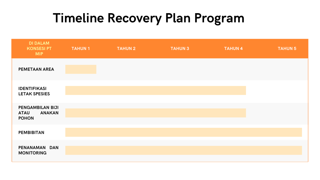 Timeline yang telah disusun ini menjadi panduan strategis untuk memastikan program recovery plan berjalan sesuai dengan jadwal. Melalui langkah-langkah ini, PT MIP berharap dapat menciptakan dampak positif dalam melestarikan ekosistem serta meningkatkan kesejahteraan masyarakat Kampung Long Ayap di masa mendatang.